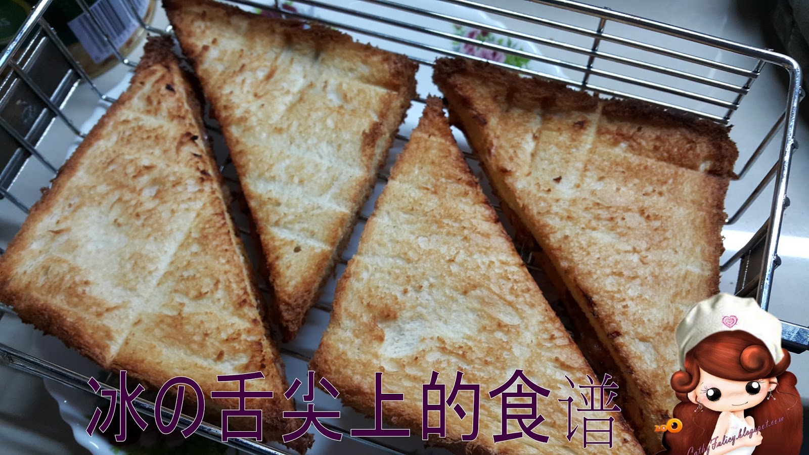 1.面包抹牛油,放入馅料,盖上另外一片,切边,切成三角形,放入转烤架,夹紧。