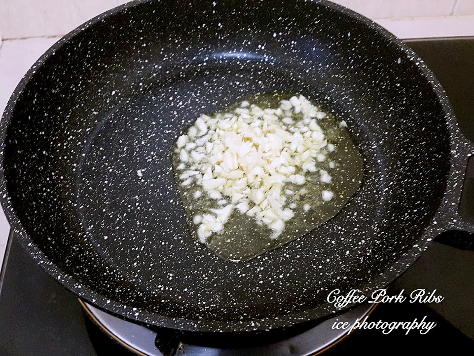 1.首先热锅,放入2汤匙橄榄油,爆香蒜米
